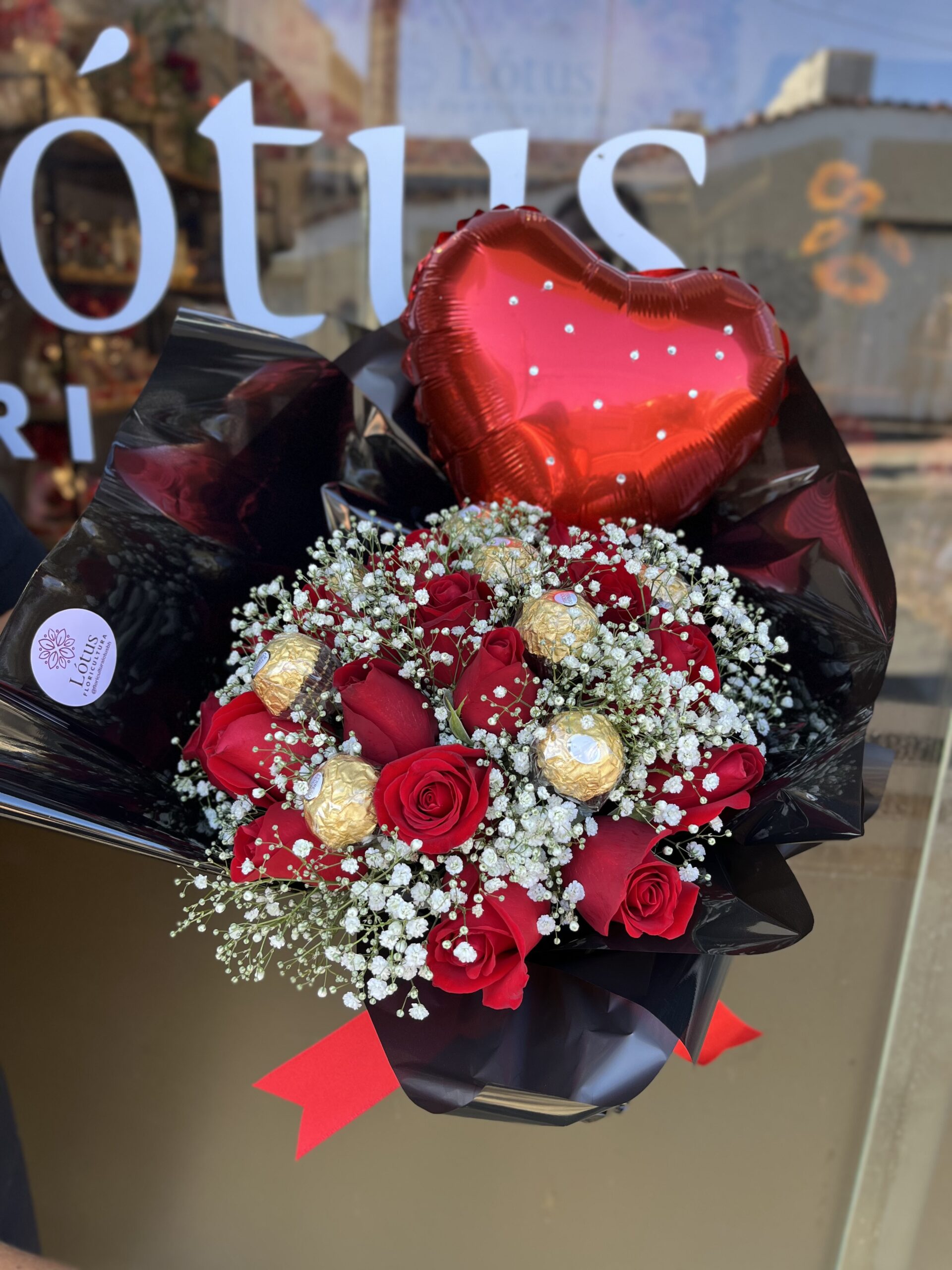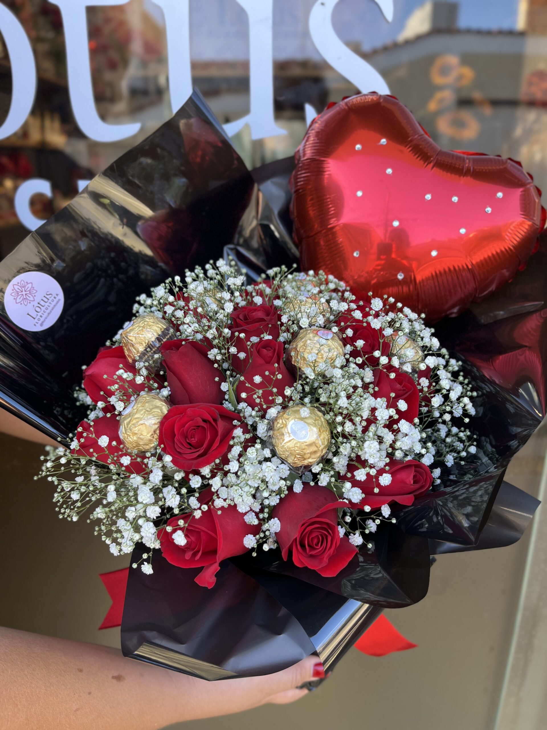 Buquê Love Luxo com 20 Rosas, 8 bombons Ferrero Rocher e uma linda embalagem super Luxo.