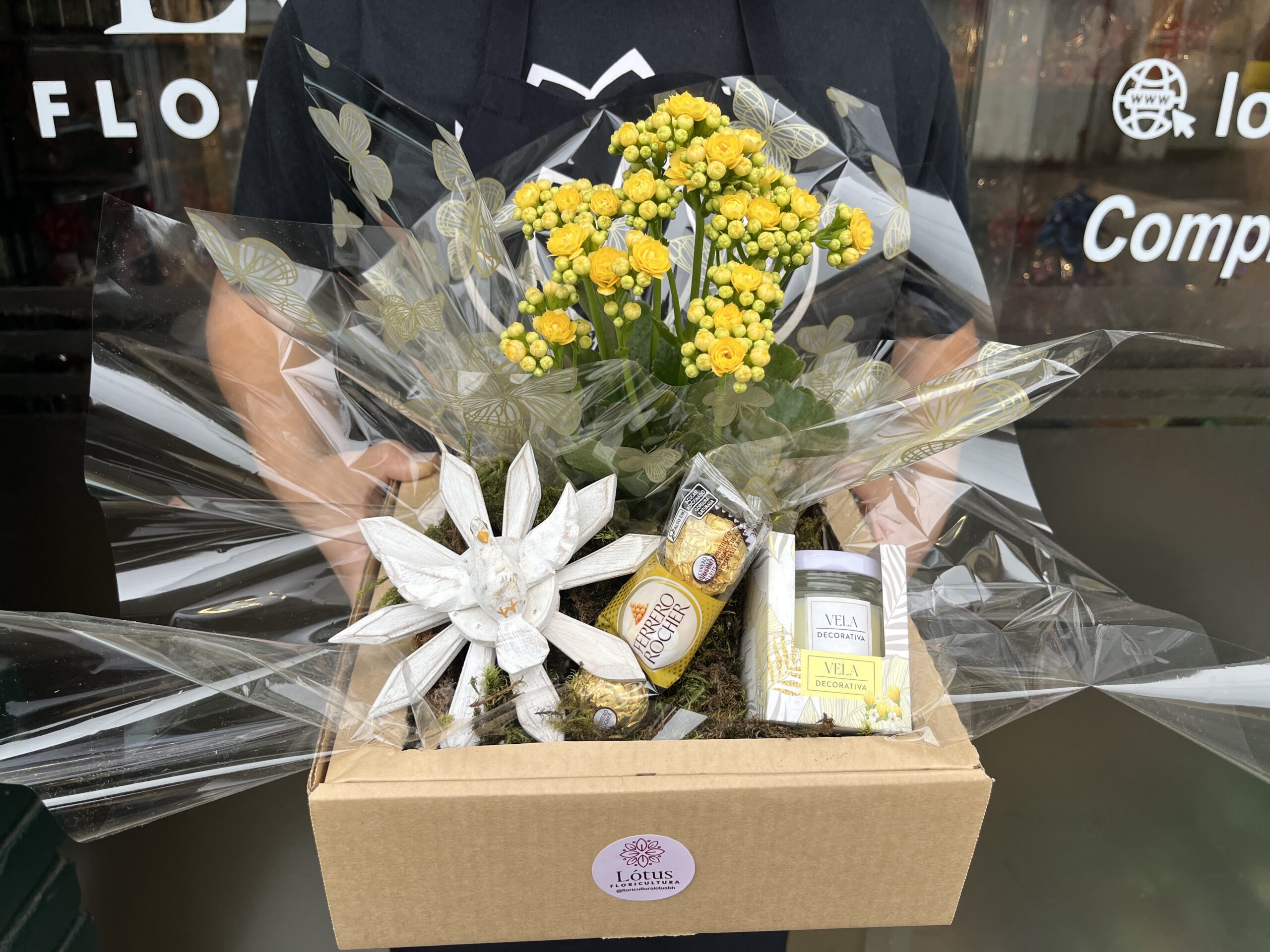Um presente lindo para Emocionar, uma Kalandiva plantada em vaso, um Espírito Santo de Madeira artesanal, uma vela decorativa e um trio de Ferrero Rocher em uma linda Box decorada.