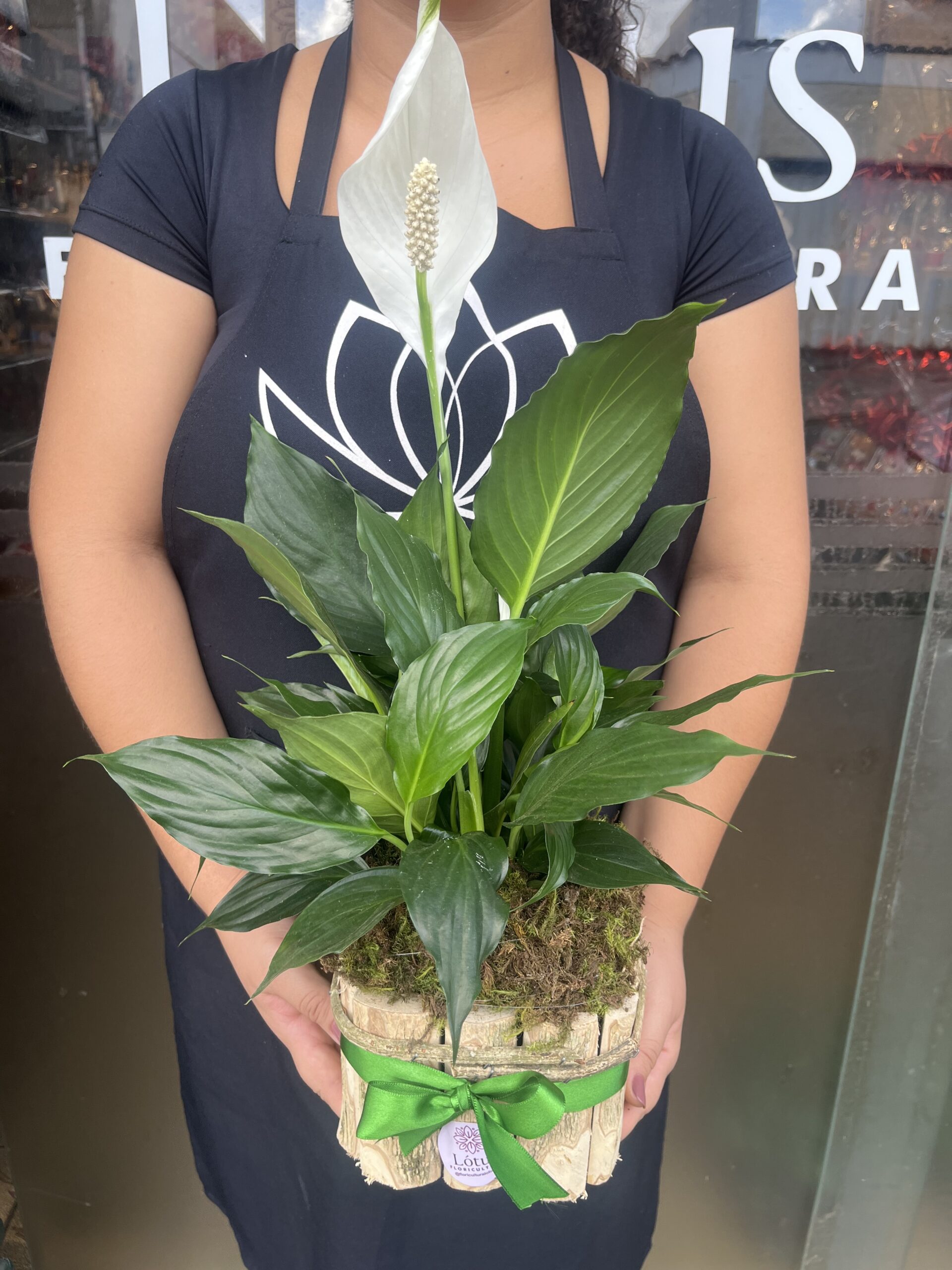 Um lindo lírio plantado em vaso, dentro de um cachepô de madeira rústica.