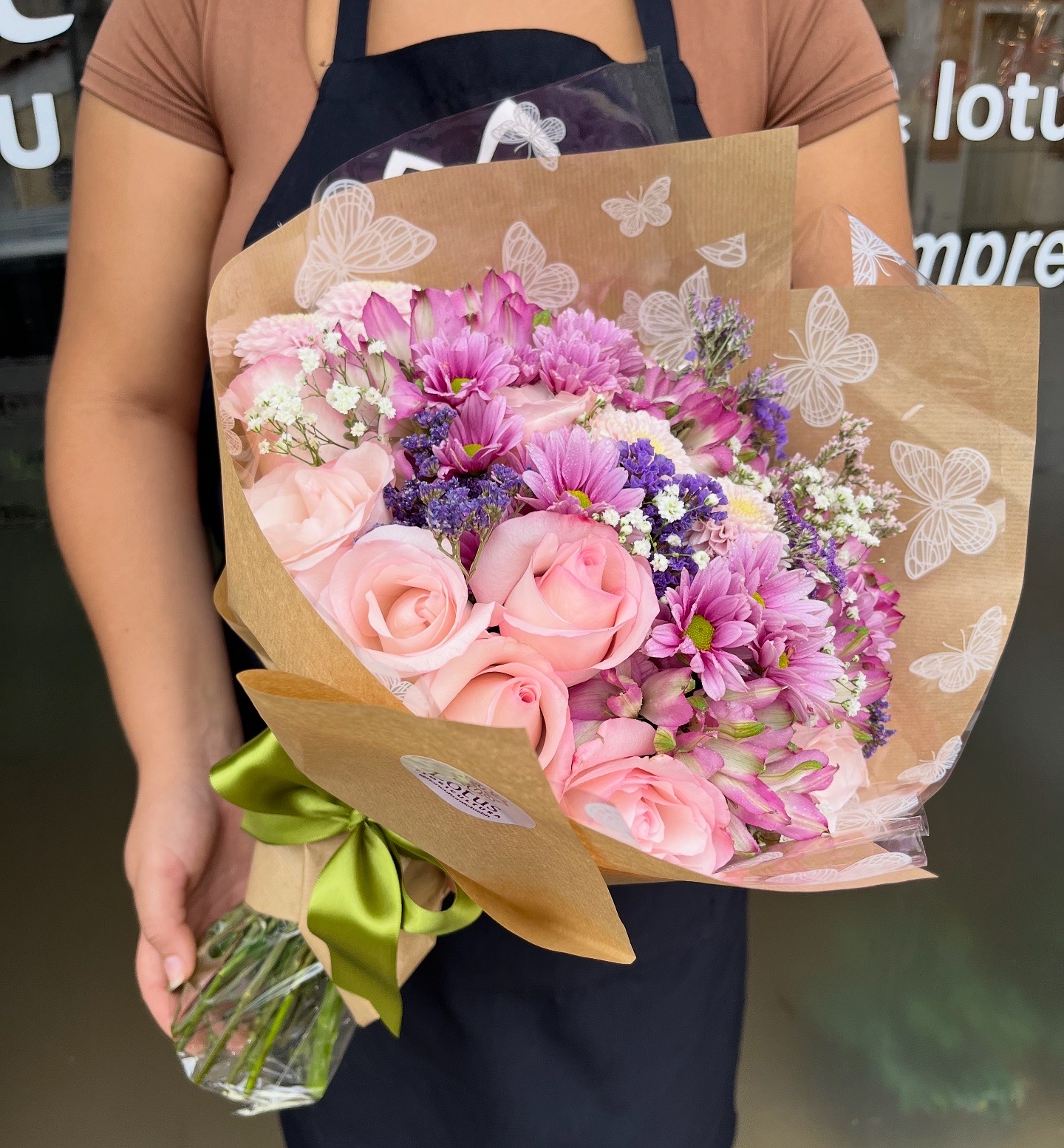 Um lindo buquê de mix de rosas com Alstroemerias tons de Rosa com folhas de Eucaflor e ruscus, finalizado no papel Kraft ou branco.